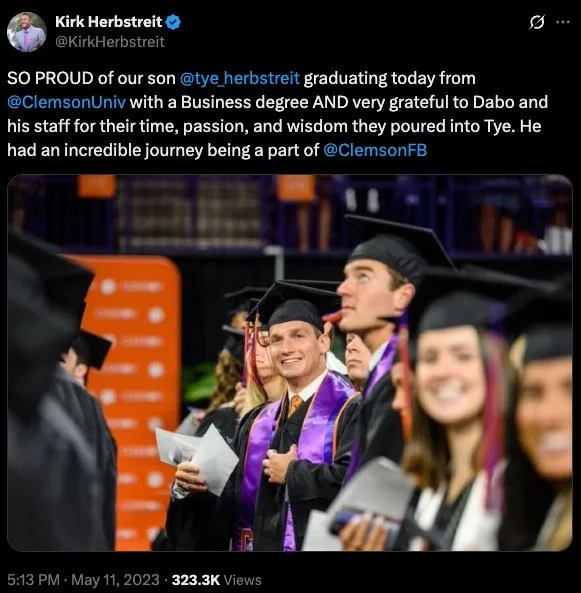 By the way, Tye went on to graduate from Clemson. Jake’s journey was cut short by health challenges, but the trust the Herbstreit family placed in Dabo speaks volumes.