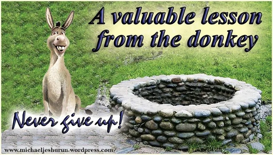 The donkey's initial reaction is to cry piteously, but then it quiets down and starts doing something amazing: with each shovel of dirt, it shakes it off and takes a step up. Let’s summarize this amazing story and identify a few of the lessons to be learned as well as what it takes to develop resilience:
